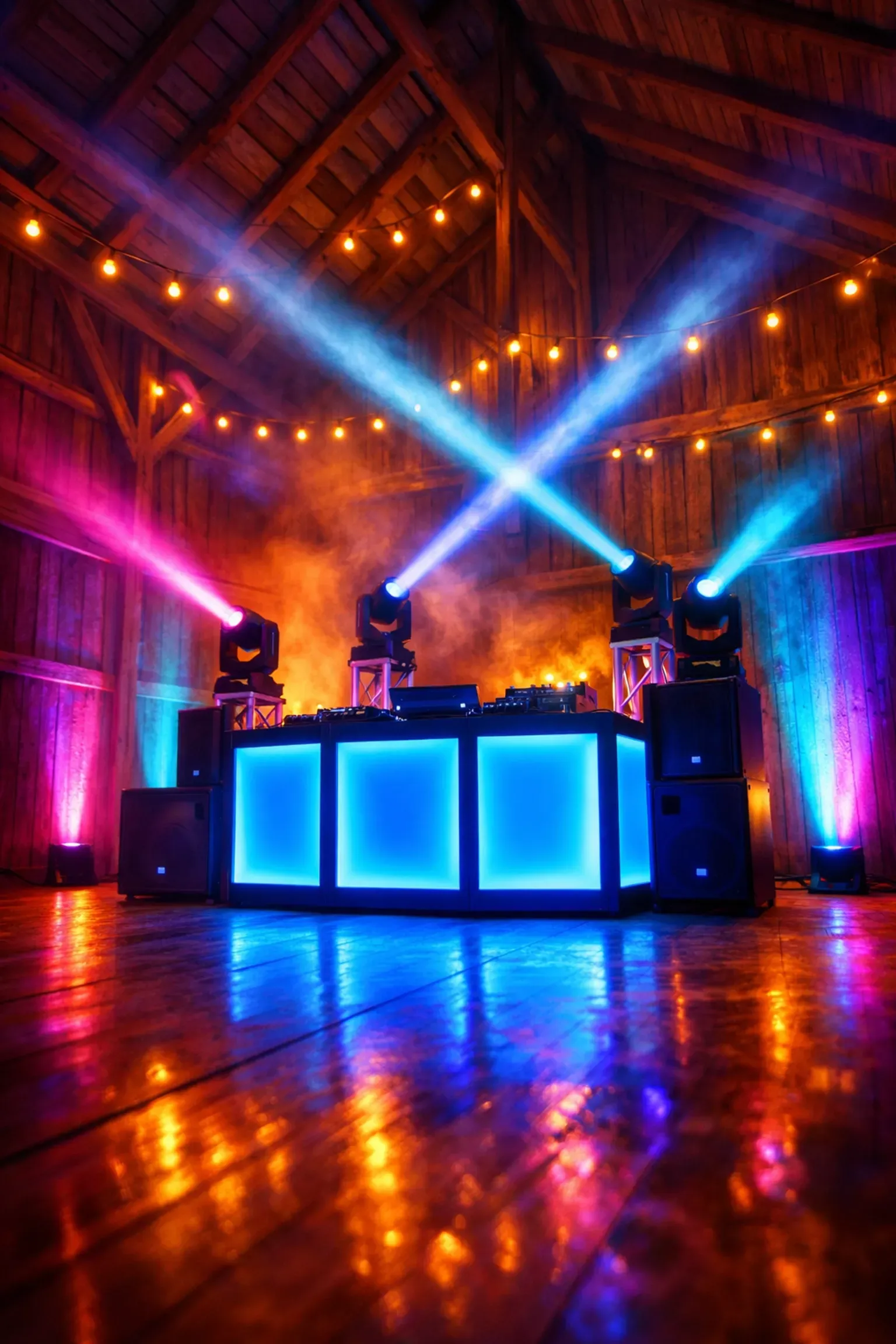 Lighting transforms your venue. Most packages include a lighting setup with moving heads, LED effects, and uplighters. We can program colors to match your theme or venue décor. Think warm amber for rustic barns, cool blues for modern spaces, or bold colors for birthday parties.